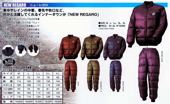 釣行の車中やレインウエアなどの中着など何かと活躍してくれる「ニューレガロ」は、釣り以外の防寒着としても活用できると大人気。圧倒的な軽さと保温力で、保温材には約30羽の水鳥の胸毛部分を使用。襟元、手首、足首部はジャージで冷気の侵入をカット。