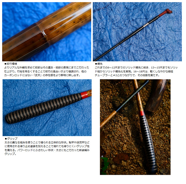 | 「荒法師 武天」はその生地組みからして他のどのへら竿とも異なる特徴を持つ。そのこだわりの最たるものが“柔軟な穂先”と“胴のしなり”。ダイワは今や先径0.8mmの極細チューブラーを作り出すことが可能な技術力を持ちながら、あえて柔軟かつ強靭なソリッド穂先にこだわった。